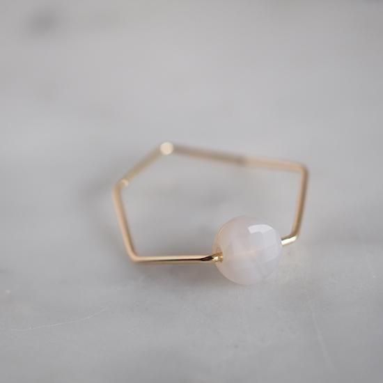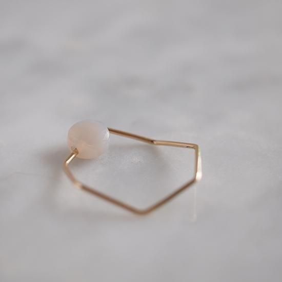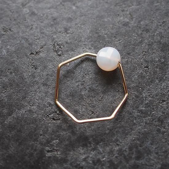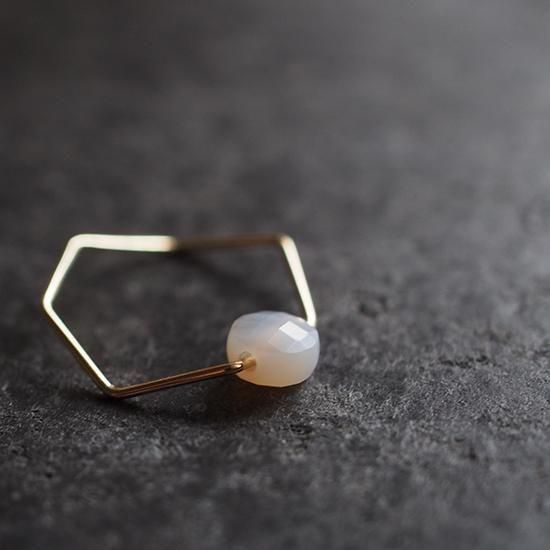 K10YGベースにアクセントとして、七角形の一辺に平たいボタン型のグレーオニキスを一粒、通したデザイン。表面のカット面が角度によりキラリと輝きます。